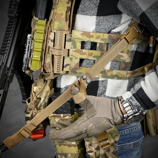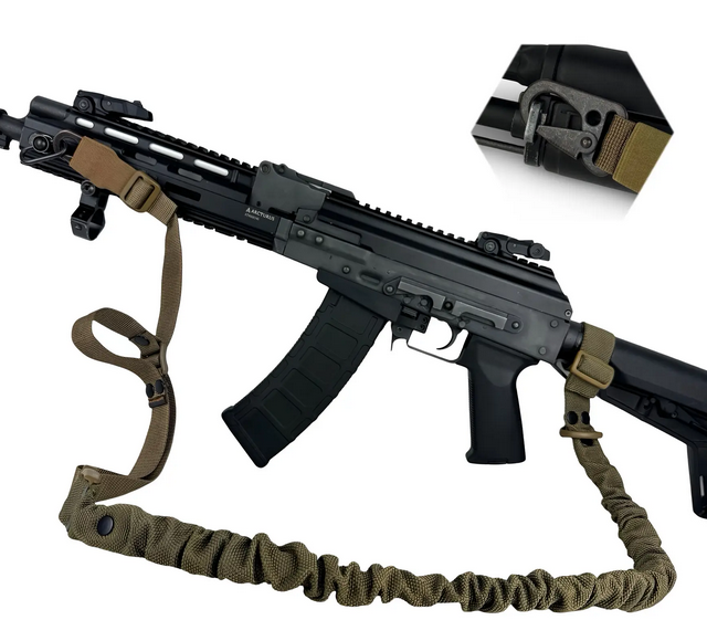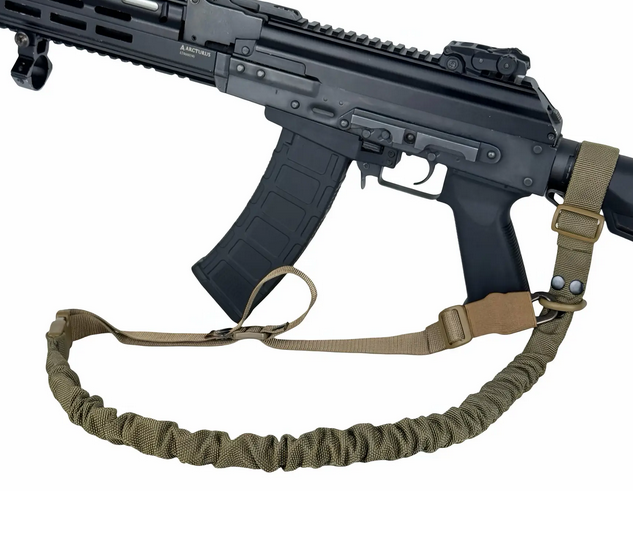 Elastyczny jedno/dwupunktowy pas do przenoszenia broni. Wyposażony w gumowy rdzeń osłonięty marszczoną taśmą, który jest elastyczny i dopasowuje się do kształtu ramienia strzelca. Zapewnia komfort użytkowania oraz stabilne oparcie broni na ramieniu a przez to poprawia precyzję celowania.