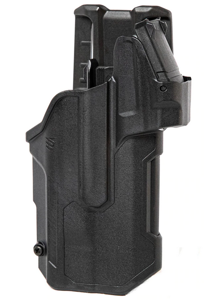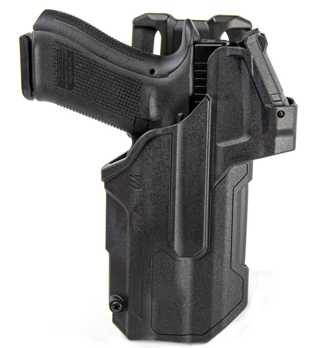 Kabura Blackhawk T-Series do broni GLOCK 17/19/22/31/32/45 RDS z latarką TLR-7/8 posiada funkcję zwalniania broni za pomocą kciuka, dzięki czemu użytkownik pozostaje w stanie gotowości przy zachowaniu całkowitego bezpieczeństwa własnego a w momencie dobycia broni gwarantuje pewny chwyt nawet w najbardziej stresujących okolicznościach. Wykonana ze wzmocnionego polimeru, wewnątrz znajduje się gładka, tłumiącą dźwięki powierzchnia o właściwościach hydrofobowych czyli odpychających cząsteczki wody. Kompatybilna z Trijicon RMR / SRO, Leupold Delta Point Pro, Sig Romeo1Pro, NightstickTCM-550XL i innymi optykami o podobnych rozmiarach. Posiada dodatkową osłonę przeciwpyłową, która chroni optykę przed uderzeniami i zanieczyszczeniami - w razie potrzeby można ją zdjąć.