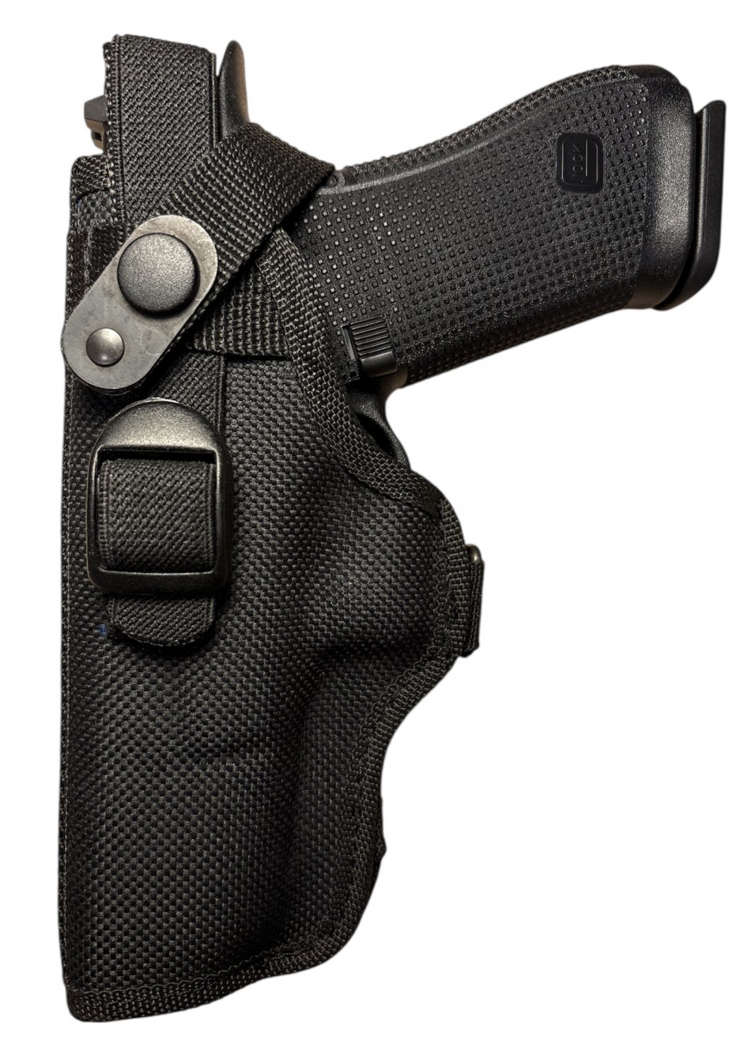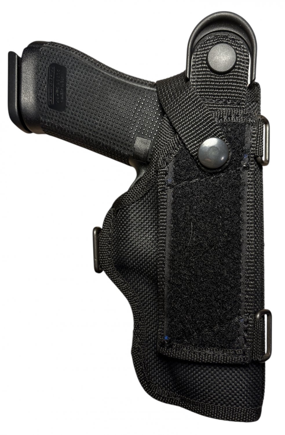 Kabura mocowana do pasa, profilowana pod kształt broni Glock 17/19/45. Wykonana jest z płyty wielowarstwowej a zewnętrzna strona z materiału Cordura 900. Produkt godny polecenia ze względu na swoją wytrzymałość i solidność wykonania. Do szybkiego wypięcia broni użyto oryginalnych klipsów firmy FOBUS.